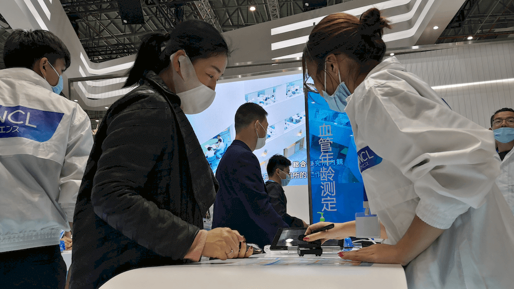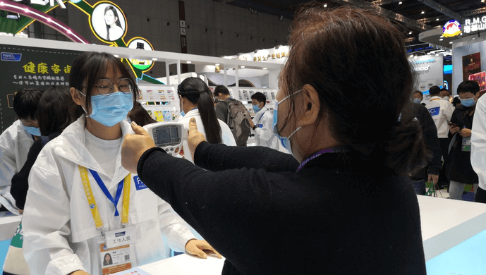 进博会医疗展区内的芳珂展台就是一个缩影,4条健康测定通道前,观众排起长龙,等待用不同的快检设备测定自己的肌肤状态、体脂率、糖化度或血管年龄,从开馆到闭馆,一刻不停。