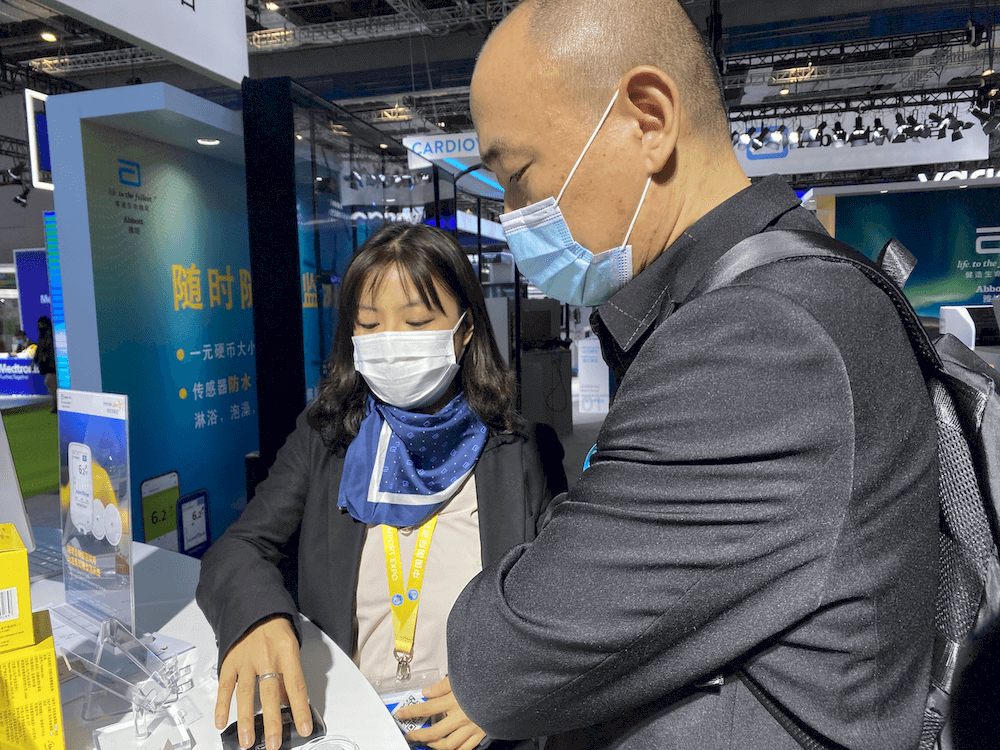 首次登陆进博会的雅培制药,也将慢病管理优化与保健品相连接。一款“不扎手指测血糖”的扫描式葡萄糖监测系统尤为火热,引来诸多关注——短短5分钟,就有20多位观众前来问询、体验。一改传统指尖采血测血糖的传统方式,使用者只要在手臂粘上一枚硬币大小、带有柔性探头的传感器,用巴掌大小的扫描仪轻轻一扫,只需一秒钟就能获得实时葡萄糖数值、葡萄糖变化趋势和波动情况,并实现24小时连续监测。国内首秀的升级版系统,还能实现及时预警等功能。
