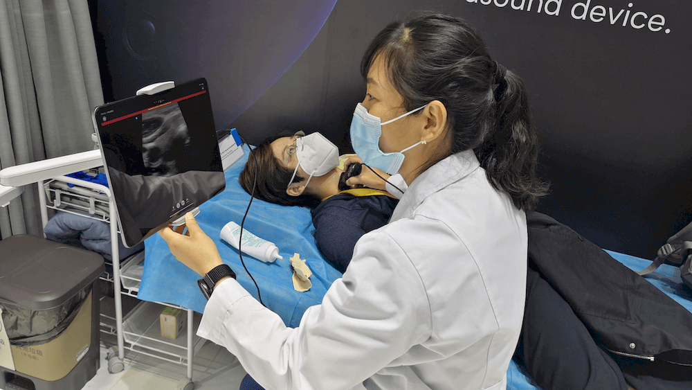 复星健康展台一角,不停有观展商躺下再站起,吸引他们的是全球首款全身通用的掌上超声成像系统Butterfly iQ+。业内人士将其称为“口袋B超”。