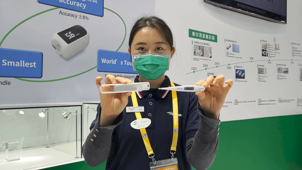 宅家医疗的需求,还带火了医疗展区内的泰尔茂株式会社展台。该展台在中国首次展出的C217医用电子体温计,是目前全球罕见的可用含氯消毒液全浸泡消毒的医用电子体温计。